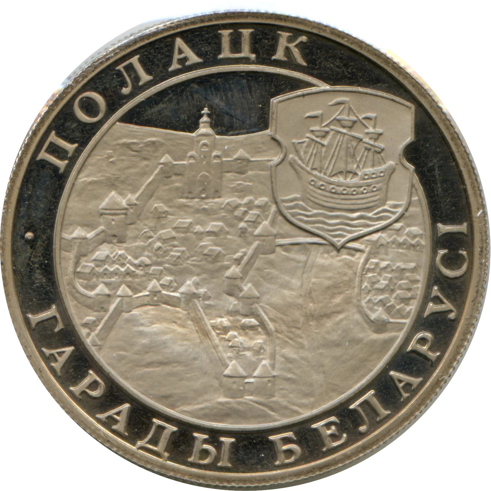 Central relief: Polotsk's 16th-century layout. Top right: the city's 16th–18th century coat of arms. Rim inscriptions: "ПОЛАЦК" and "ГАРАДЫ БЕЛАРУСI".