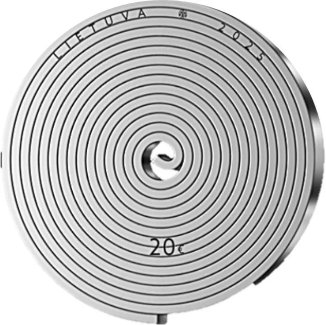The obverse features "LIETUVA," the Lithuanian Mint mark, and 2025 on a spiral strip, with the €20 denomination below the center.