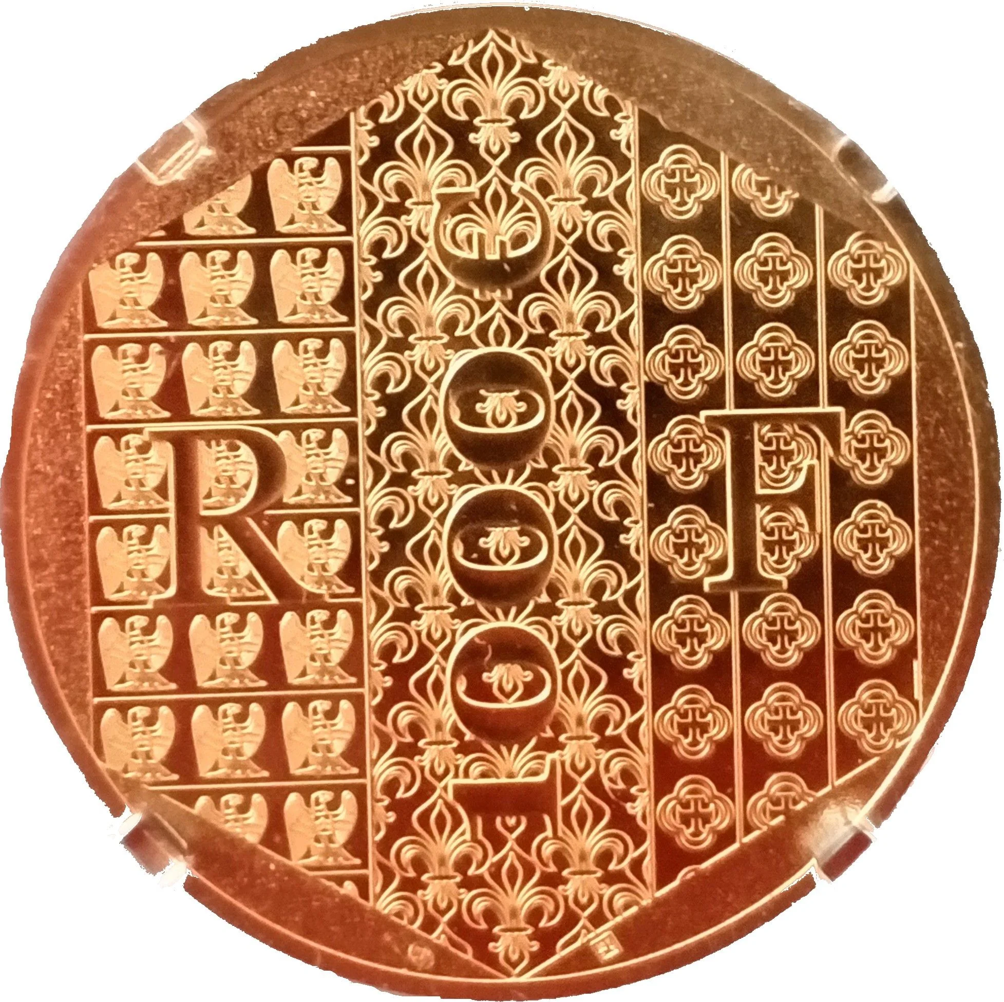 This modern reinterpretation of the historic Franc à cheval coin—originally issued in 1360 to celebrate King Jean II's liberation—features the monarch charging into battle. The updated design modernizes the original quatrefoils and vegetal crosses, evoking the Gothic style of the era.