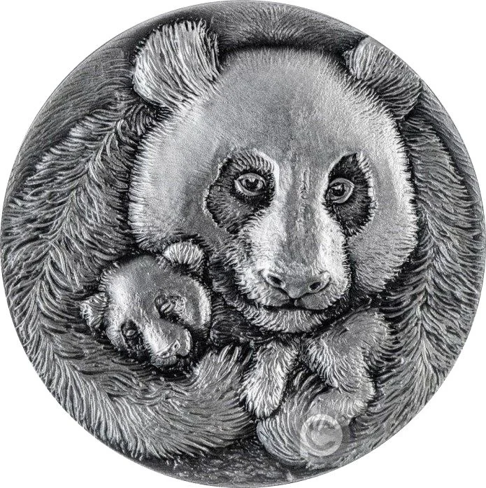 A giant panda mother and cub in a close embrace.