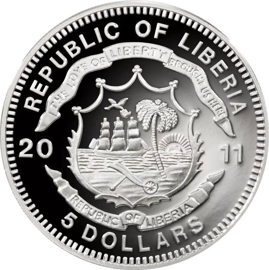 Liberian coat of arms divides date, denomination below.