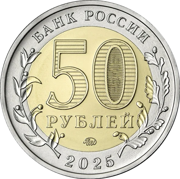 The disc's centre shows '50 РУБЛЕЙ', with '50' and 'РУБ' hidden inside the zero and visible at different angles, plus the mint mark. The outer ring displays 'БАНК РОССИИ' above, '2025' below, and stylised laurel and oak branches on the sides, extending onto the disc.