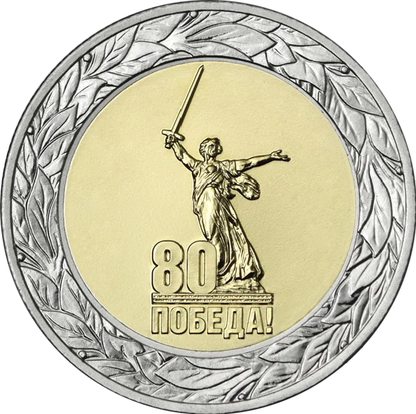 The disc features a relief of the 80th Anniversary of Victory logo and a laurel wreath around its ring.