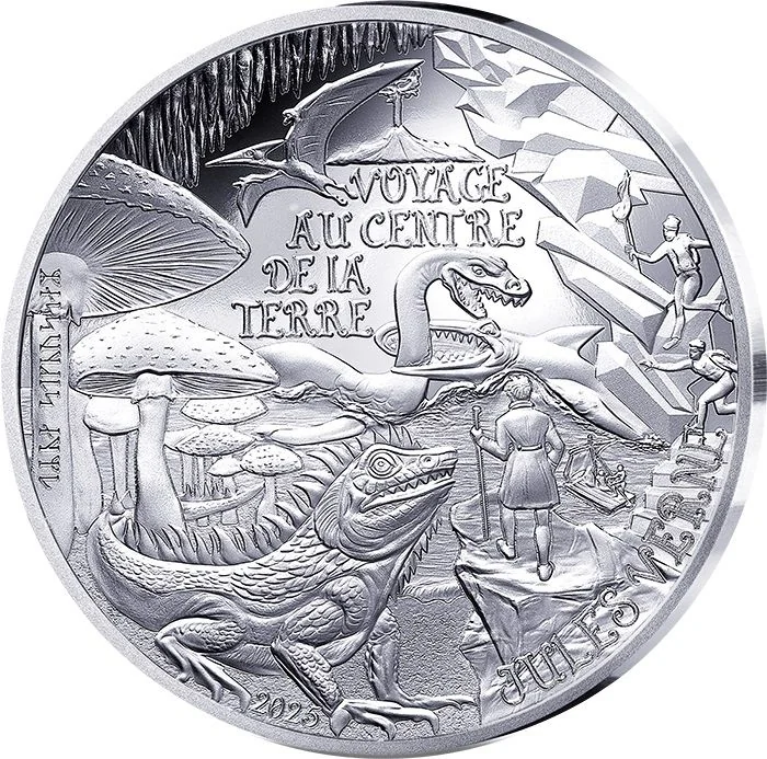 A prehistoric monster looms in the foreground as Professor Lidenbrock scans the horizon. The central raft nearly collides with dueling sea creatures, while other characters explore the mineral world. A giant mushroom bears runic clues, and Stromboli erupts in the distance, marking the explorers' exit. The title is centered, with the date and author below.