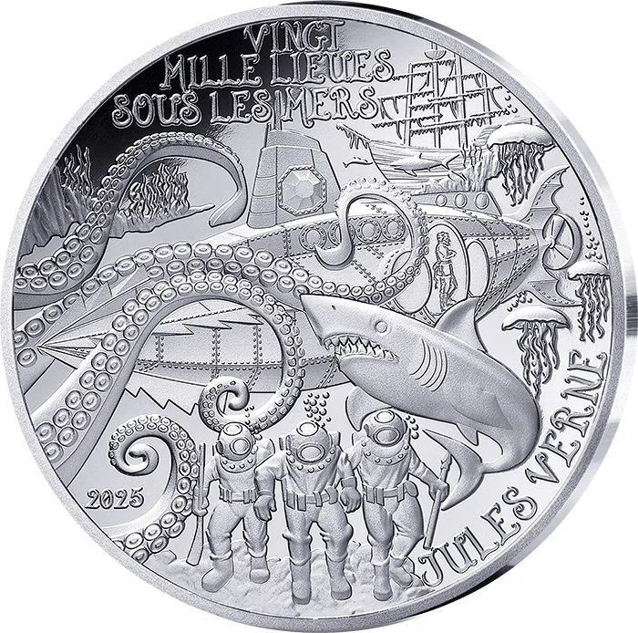Captain Nemo commands the Nautilus against a giant squid, while divers search for treasure near an ancient shipwreck. This scene evokes the marine adventures of Jules Verne's "Twenty Thousand Leagues Under the Sea" (2025).