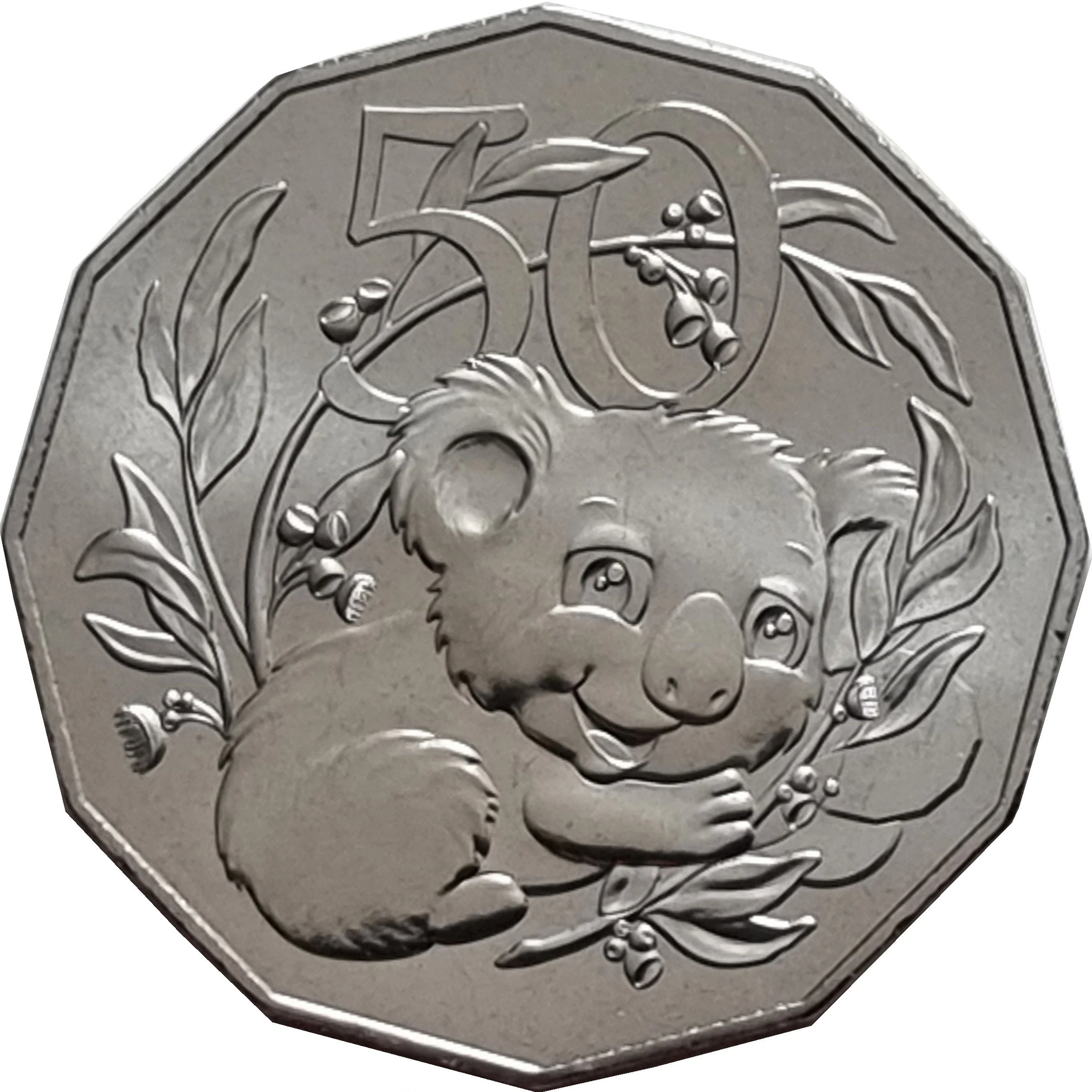A koala joey holding a gum nut branch, with 50-cent coin outlines in the background.