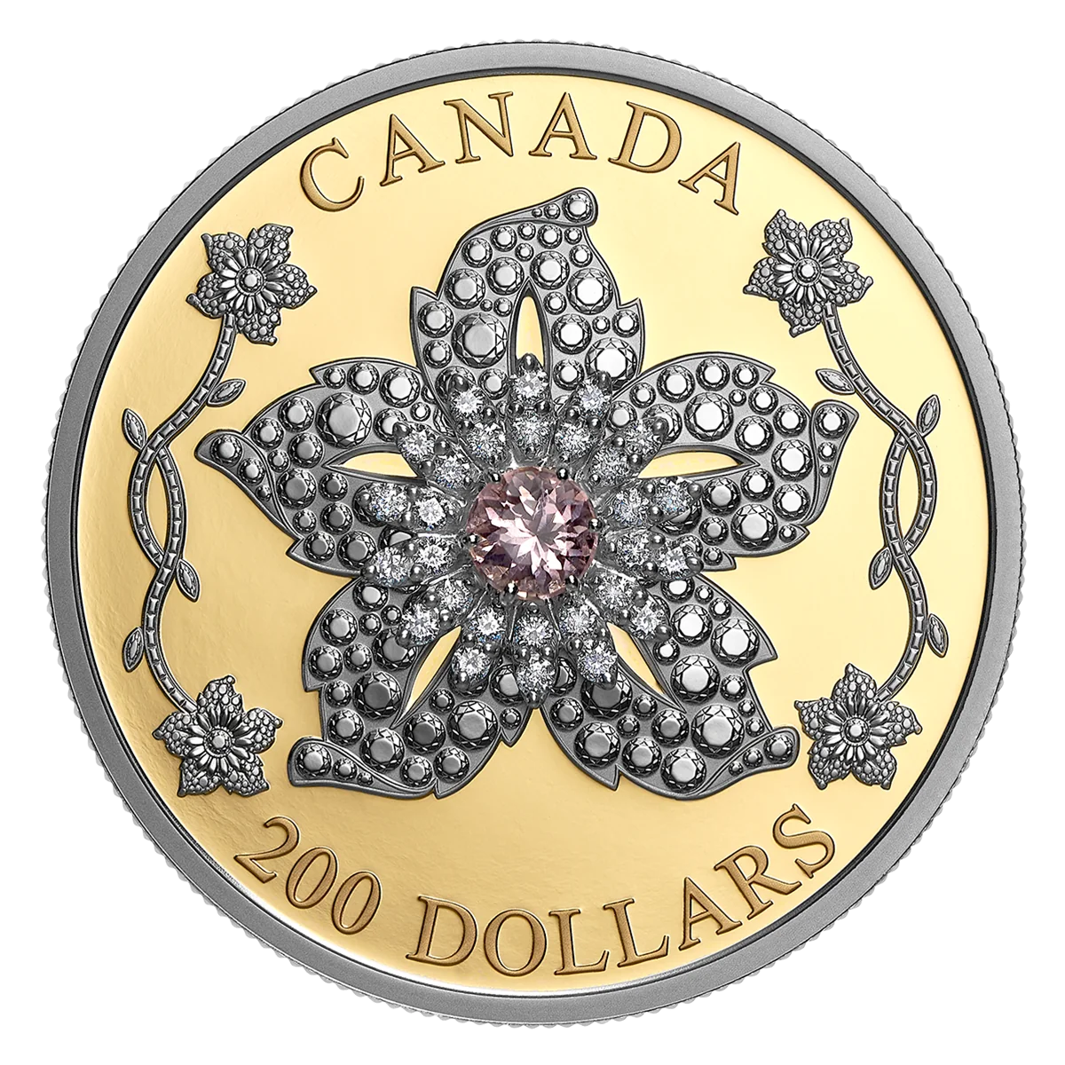 The reverse depicts the Williamson Diamond Brooch, featuring an engraved jonquil flower with a silver-and-platinum-plated mount. This holds a 0.50-carat pink tourmaline and 28 diamonds (0.41 carats total). The flanking engraved floral accents are also platinum-plated.