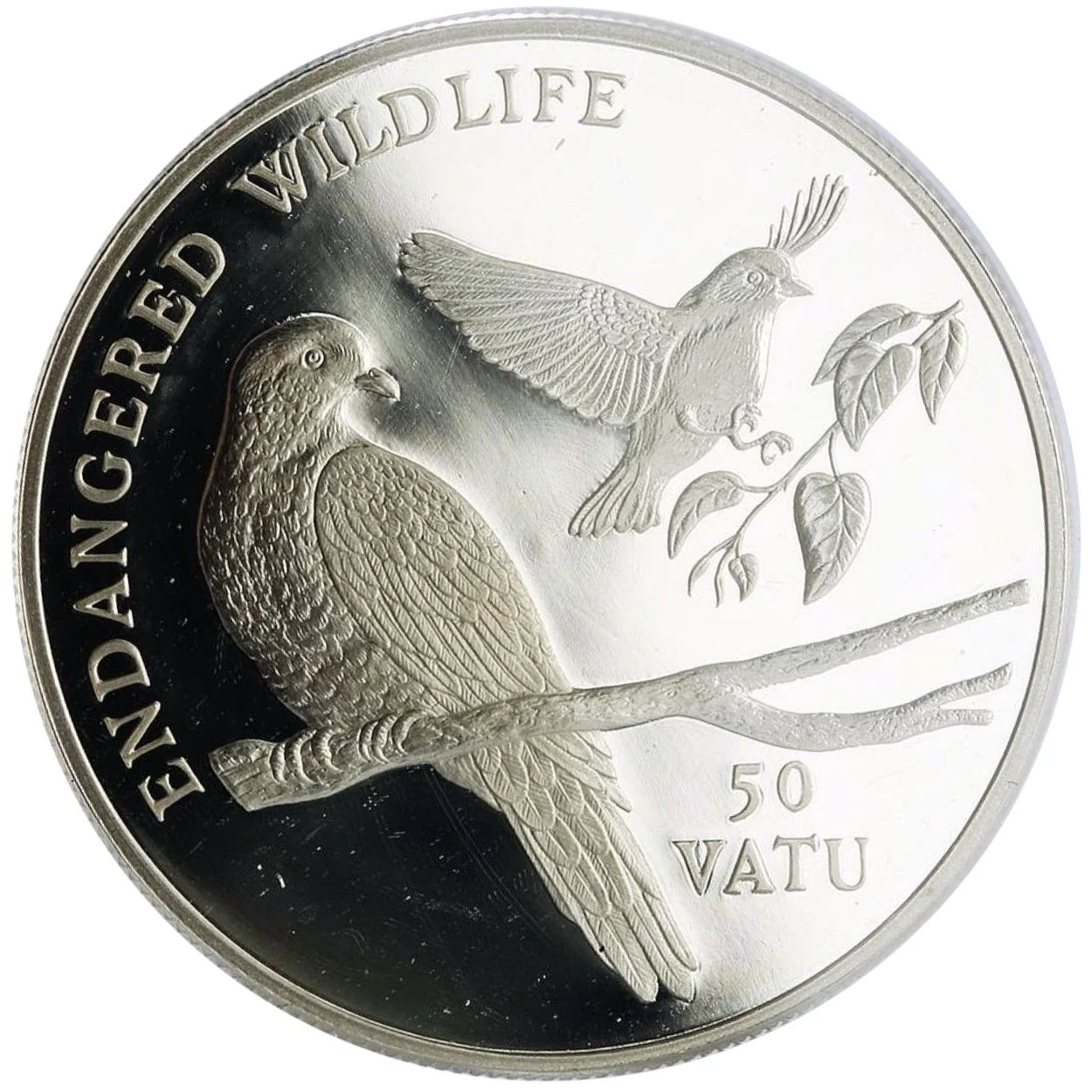 Earth Pigeons centered. "ENDANGERED WILDLIFE" top left, "50 VATU" bottom right.