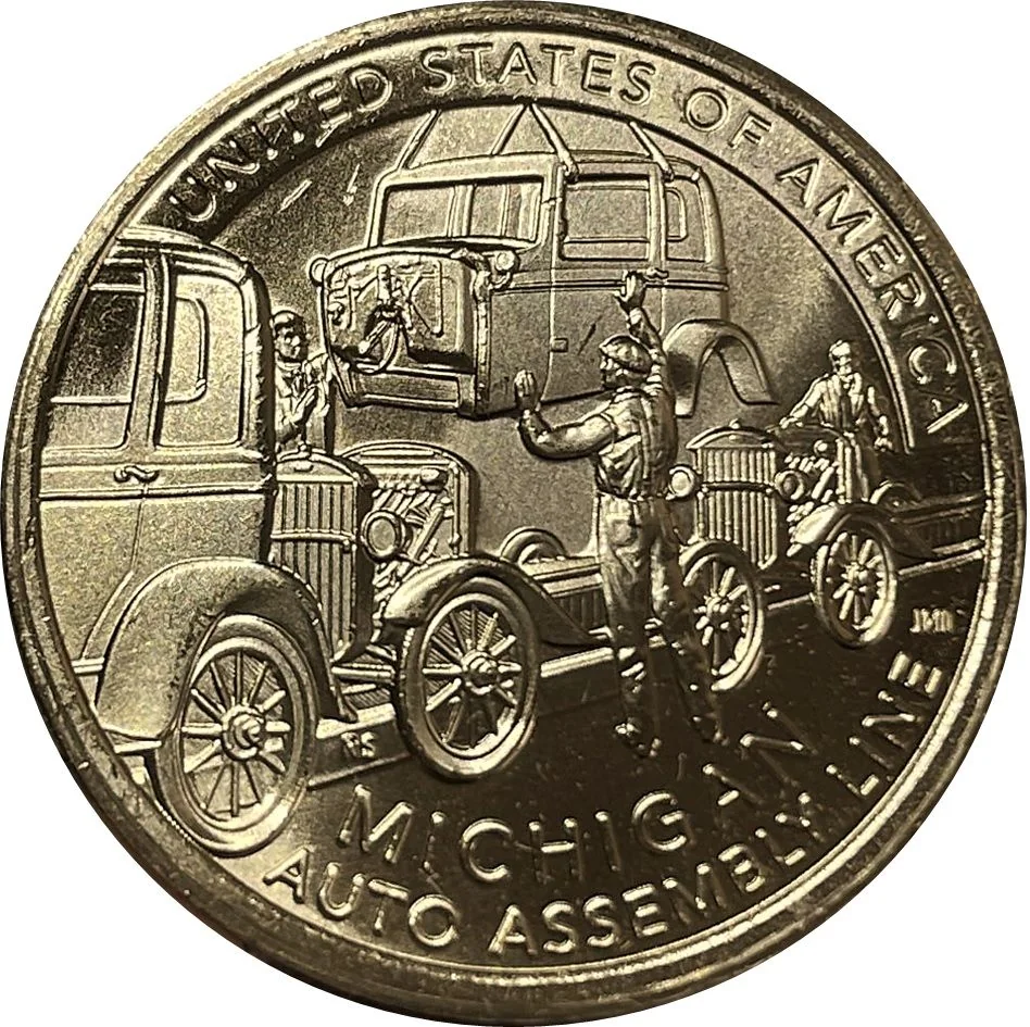 The reverse depicts a 1930s auto assembly line lowering a cab into place.