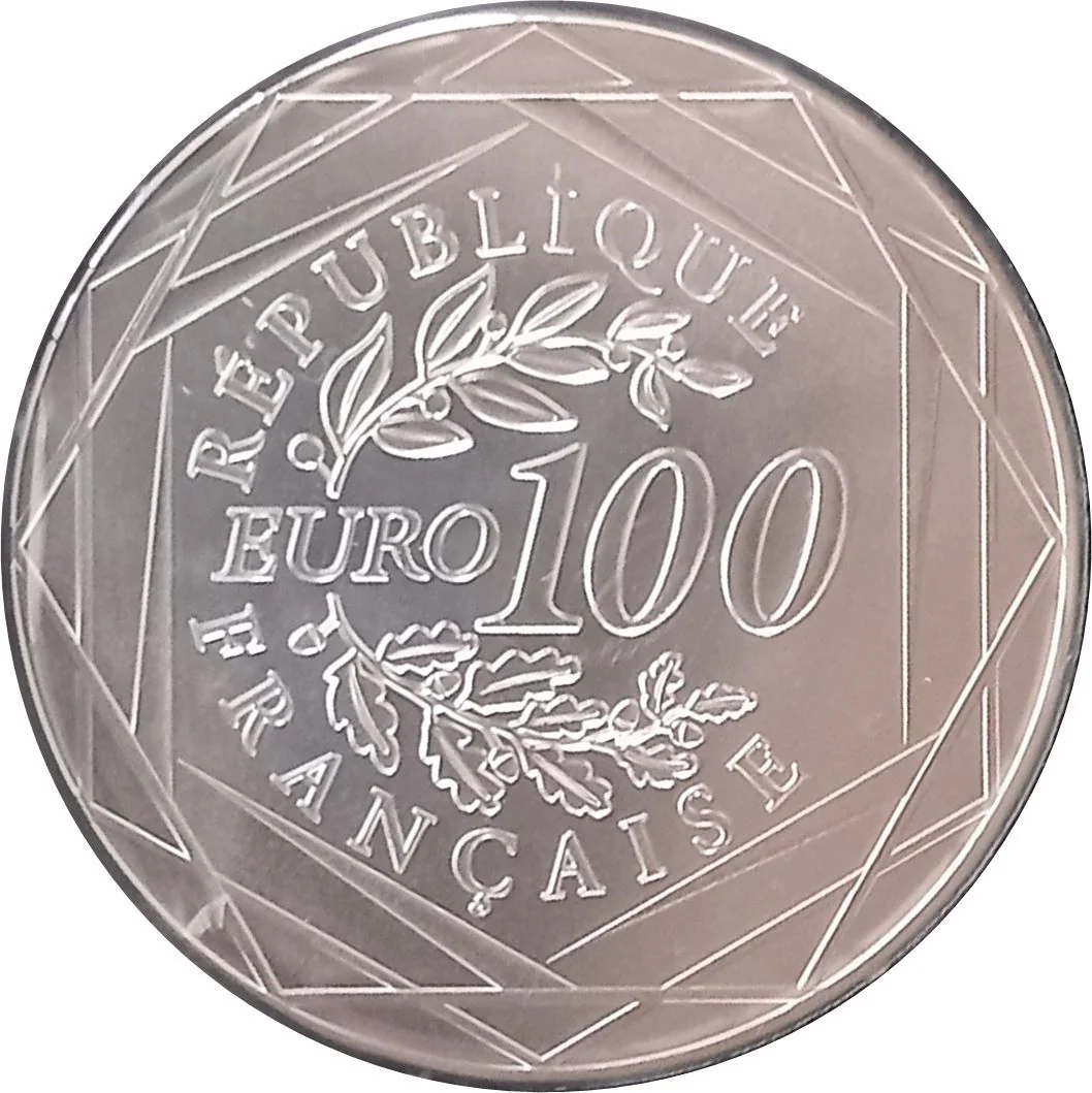 "100 EURO" between laurel and oak branches, encircled by "RÉPUBLIQUE FRANÇAISE" in three hexagons and the year.