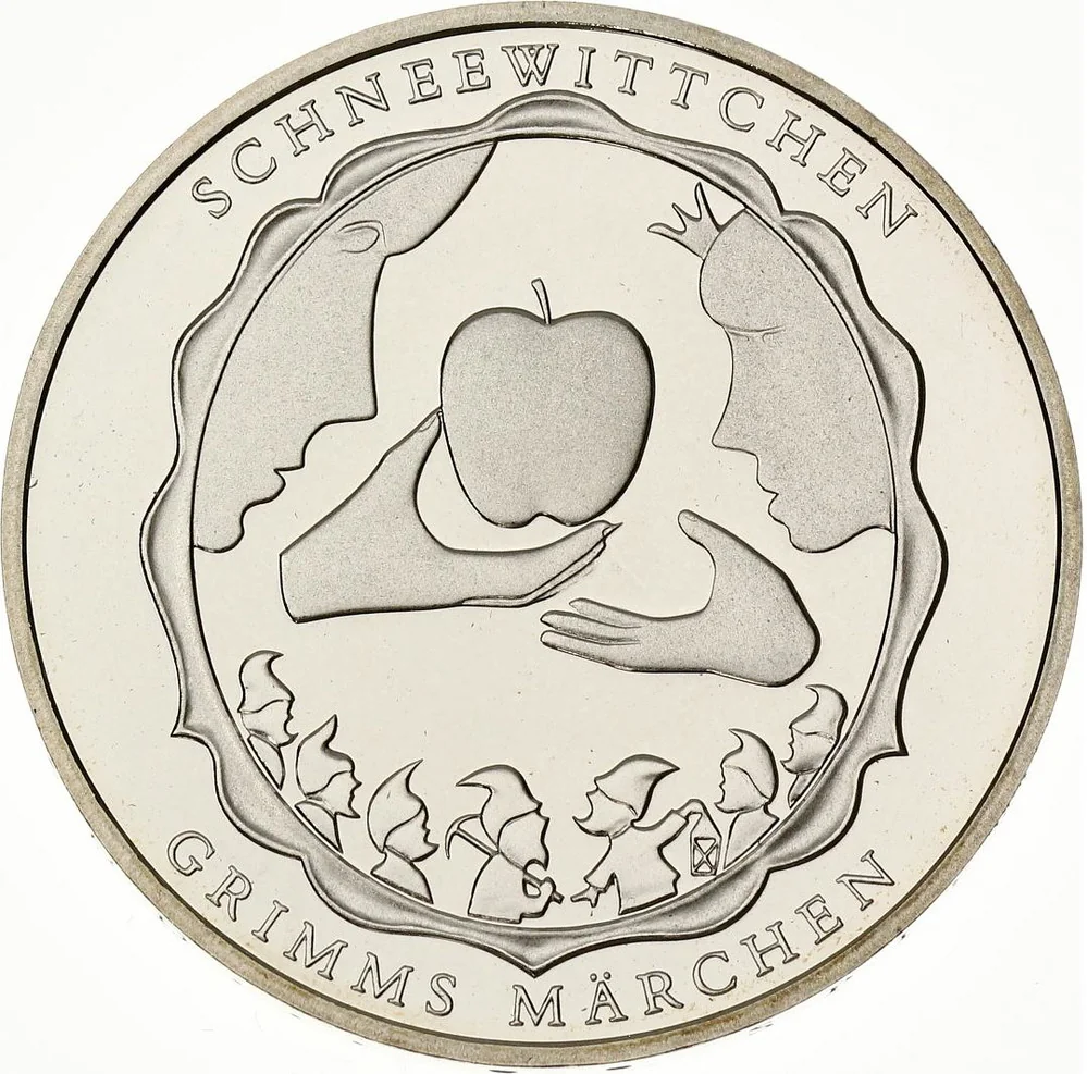 A round mirror with two faces facing each other, an apple between them held by two hands. Below, seven dwarves gaze at the apple.