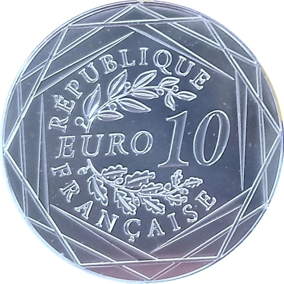 "10 EURO" flanked by laurel and oak branches, with "RÉPUBLIQUE FRANÇAISE" inscribed in three hexagons.