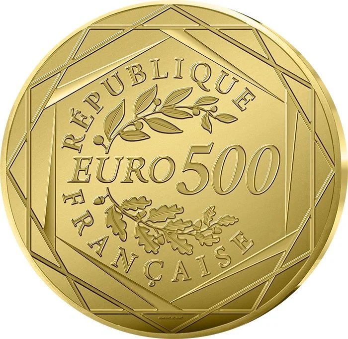 "500 EURO" flanked by laurel and oak branches, encircled by "RÉPUBLIQUE FRANÇAISE" in three hexagons.