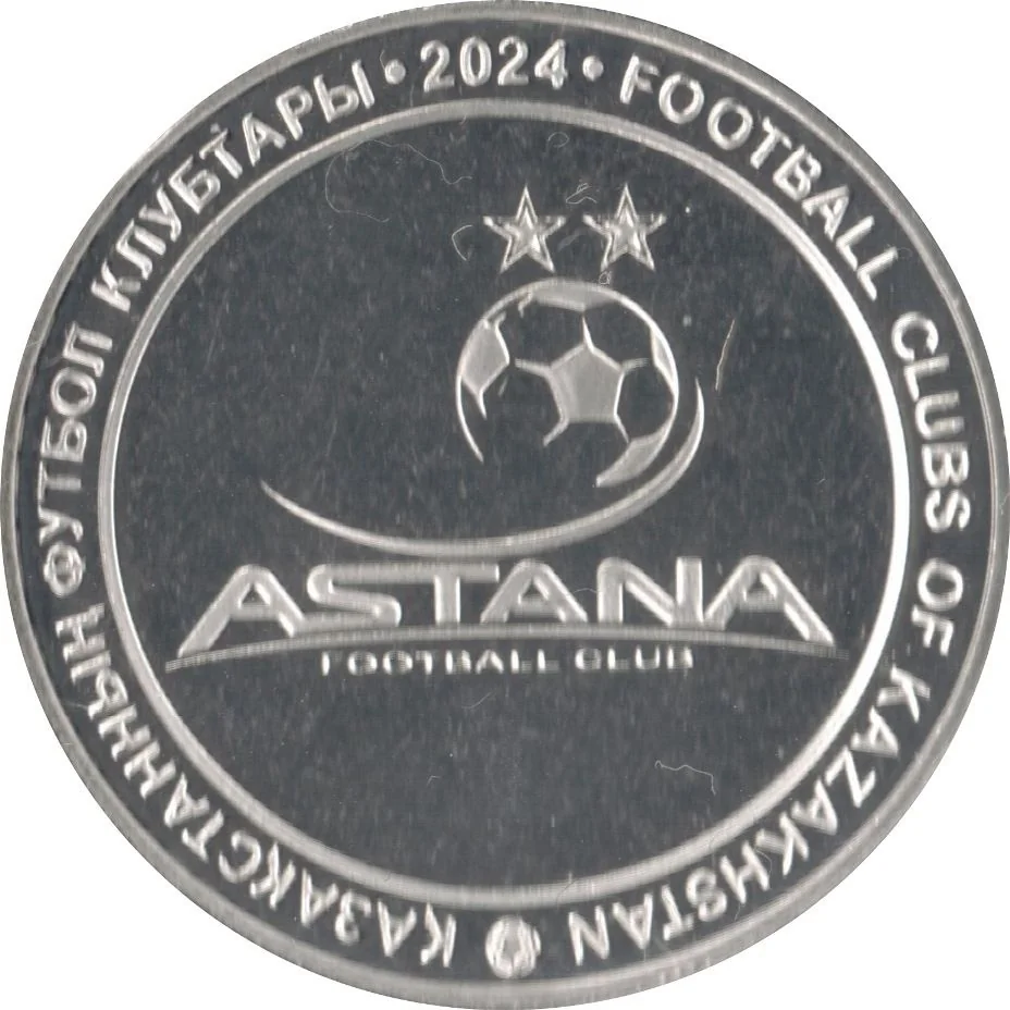 Description: The coin's center features the ASTANA football club emblem, with the issue year above. Around the circumference are the inscriptions: ҚАЗАҚСТАННЫҢ ФУТБОЛ КЛУБТАРЫ (left) and FOOTBALL CLUBS OF KAZAKHSTAN (right).