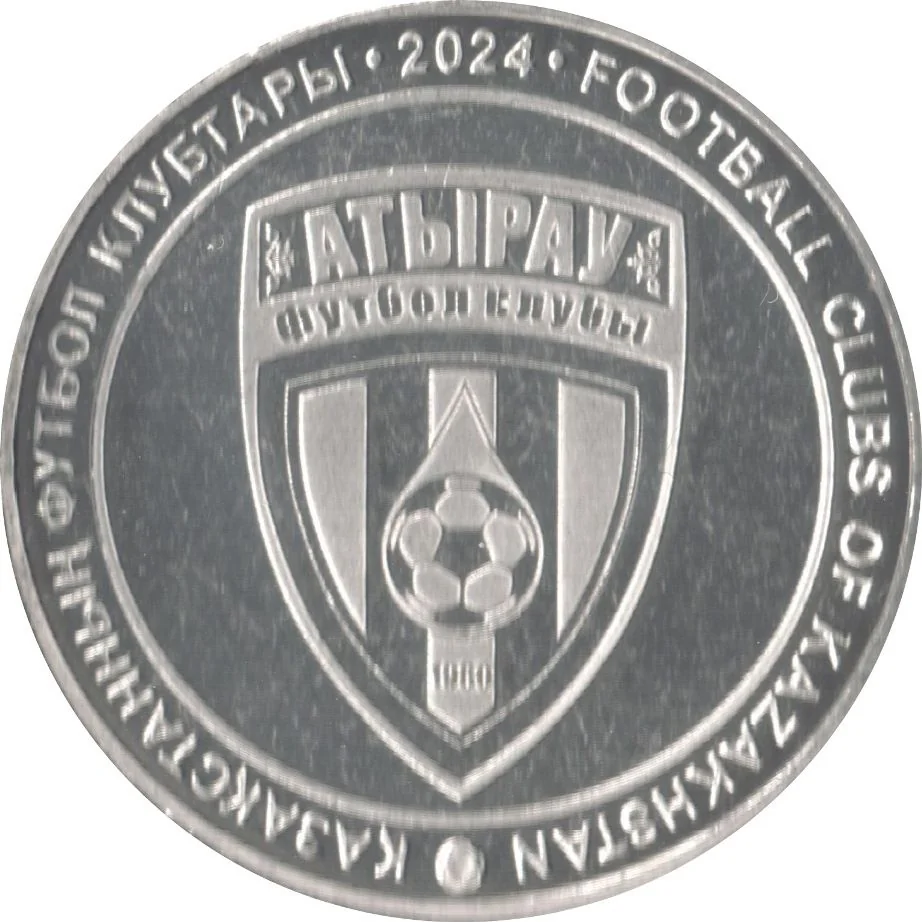 Description: The ATYRAU football club emblem is centered, with the issue year above. Around the circumference are the inscriptions "ҚАЗАҚСТАННЫҢ ФУТБОЛ КЛУБТАРЫ" (left) and "FOOTBALL CLUBS OF KAZAKHSTAN" (right).