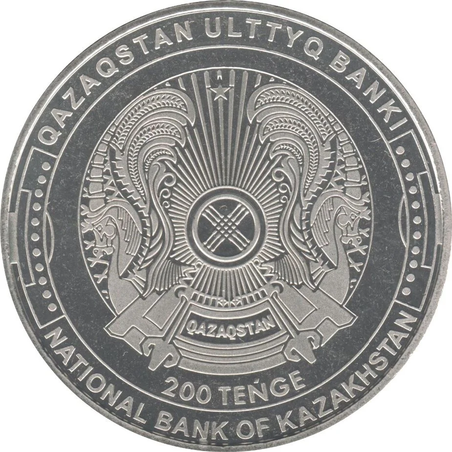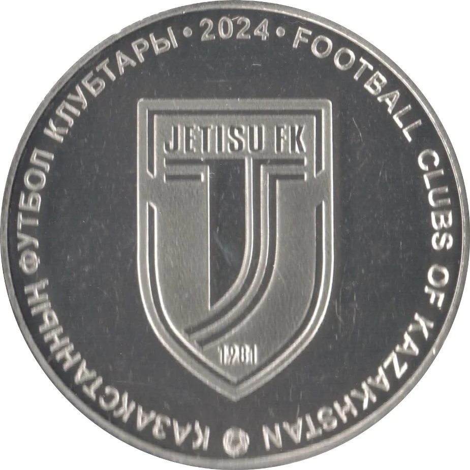Description: The coin's center features the ZHETISU club emblem, with the issue year above. Around the circumference are the inscriptions "ҚАЗАҚСТАННЫҢ ФУТБОЛ КЛУБТАРЫ" (left) and "FOOTBALL CLUBS OF KAZAKHSTAN" (right).