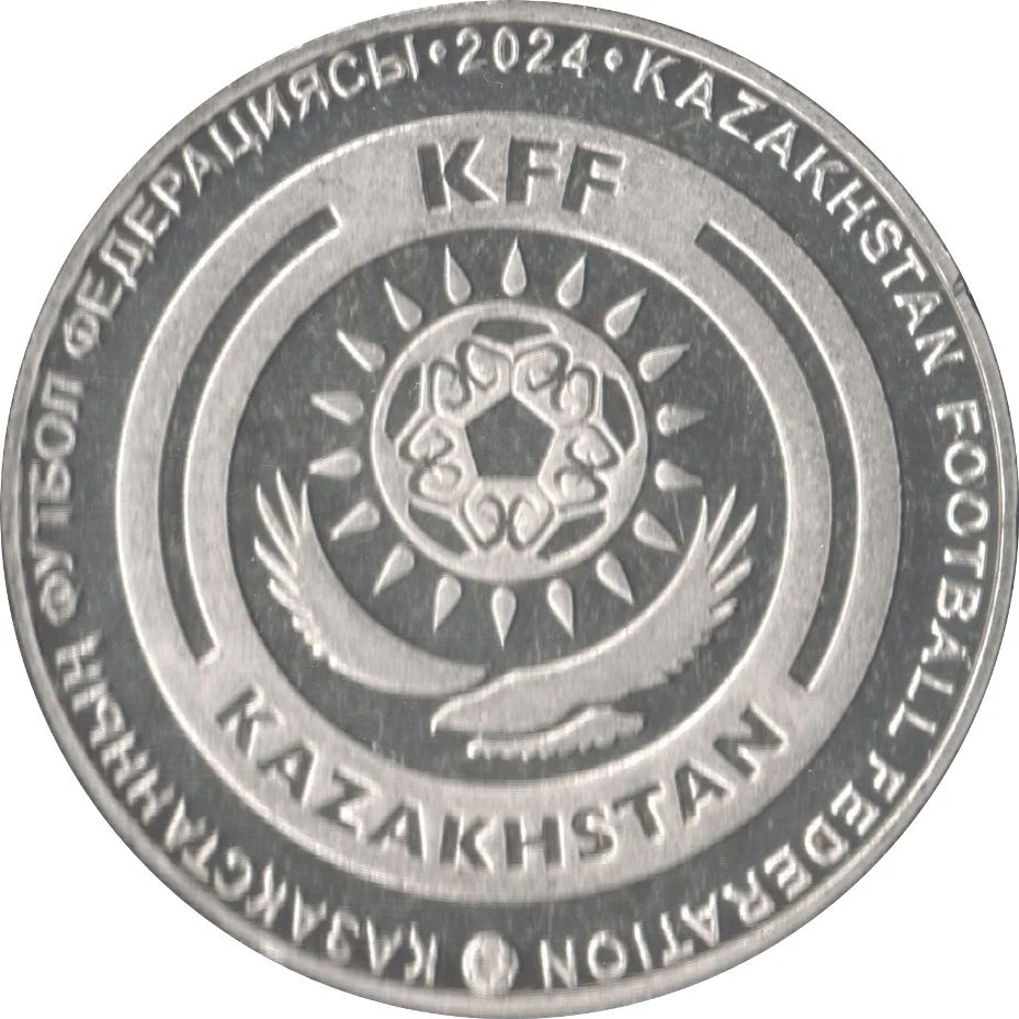 Description: Centered is the Kazakhstan Football Federation emblem, with the issue year above. Around the edge are inscriptions: ҚАЗАҚСТАННЫҢ ФУТБОЛ ФЕДИРАЦИЯСЫ (left) and KAZAKHSTAN FOOTBOL FEDERATION (right).
