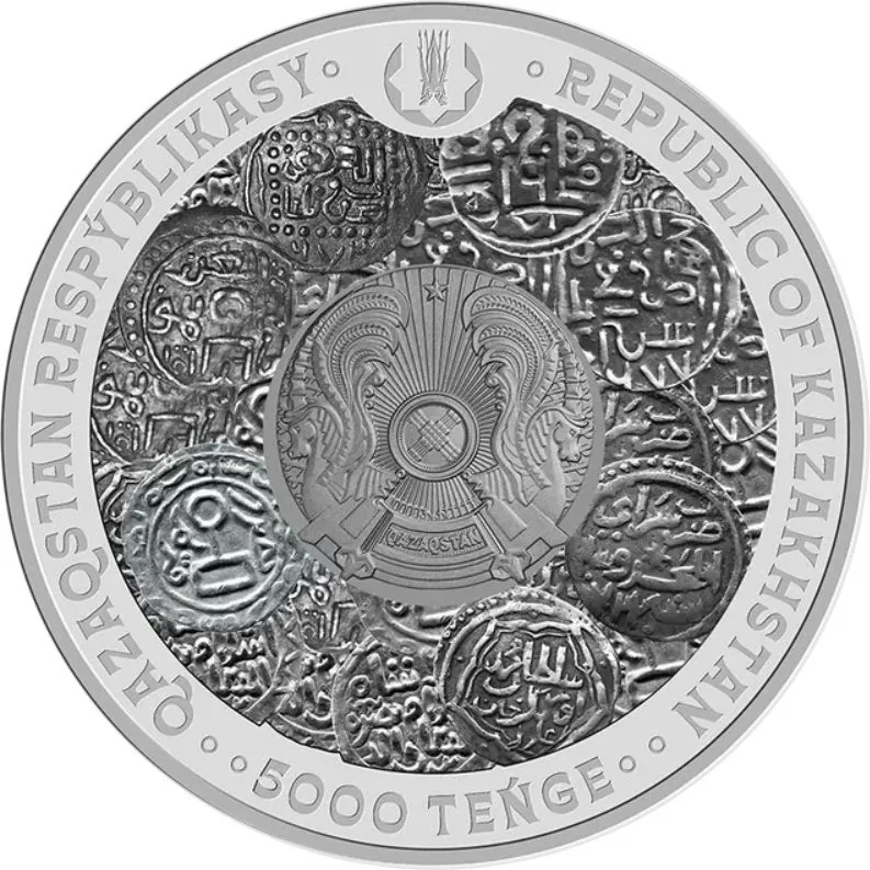 Description: The reverse features Gaziz Eshkenov's monument to Khan Zhoshy. The left shows the issue year, the right the metal specification, and the bottom the inscription "JOSHY ULYSY, 800 JYL." A national ornament encircles the coin.