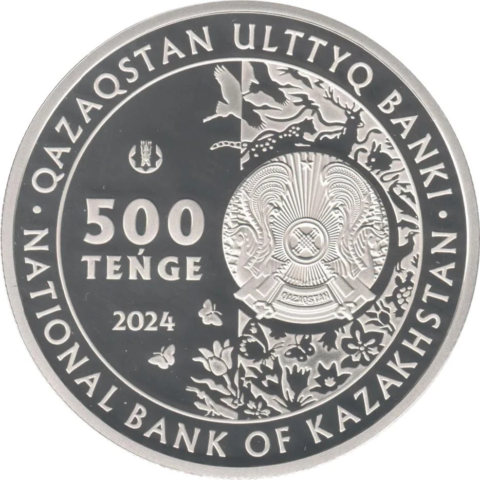 Description: The right side features Kazakhstan's state emblem surrounded by flora and fauna; the left shows the National Bank logo, denomination, and year. Around the edge are the inscriptions "QAZAQSTAN ULTTYQ BANKI" (top) and "NATIONAL BANK OF KAZAKHSTAN" (bottom).