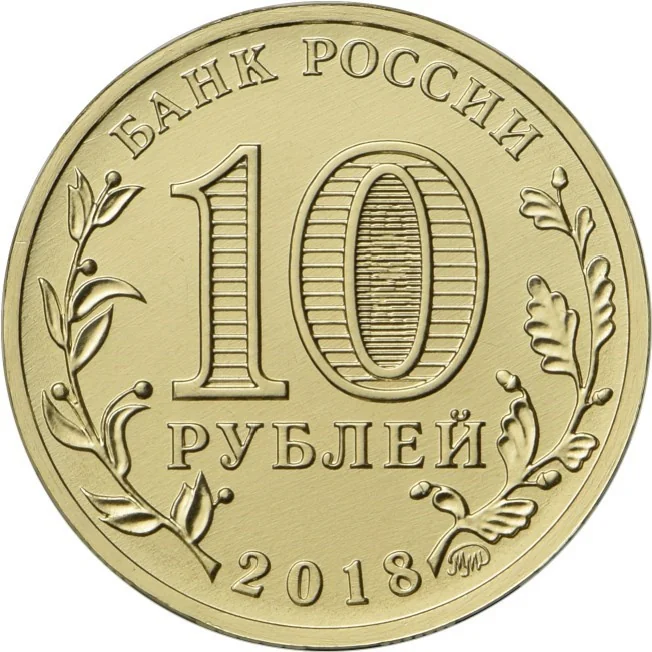 Circumferential inscriptions: "БАНК РОССИИ" (top) and "2018" (bottom). Stylized laurel (left) and oak (right) branches flank the central face value: "10 РУБЛЕЙ". Inside the '0' is a hidden "10 РУБ" element visible at different angles. The mint mark is at the bottom.