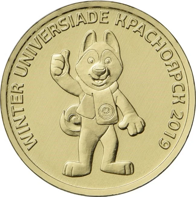 A relief image of U-Laika, the 29th Winter Universiade mascot, encircled by the inscription "WINTER UNIVERSIADE КРАСНОЯРСК 2019".