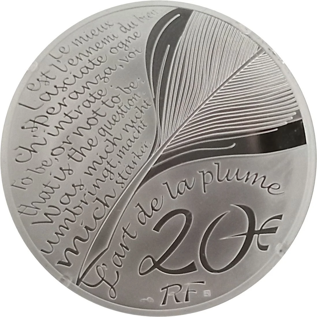 Inscribed with emblematic quotations, the piece centers on an engraved feather above the series title. The lower right corner bears "RF," Joaquin Jimenez's hallmark, and the workshop mark.