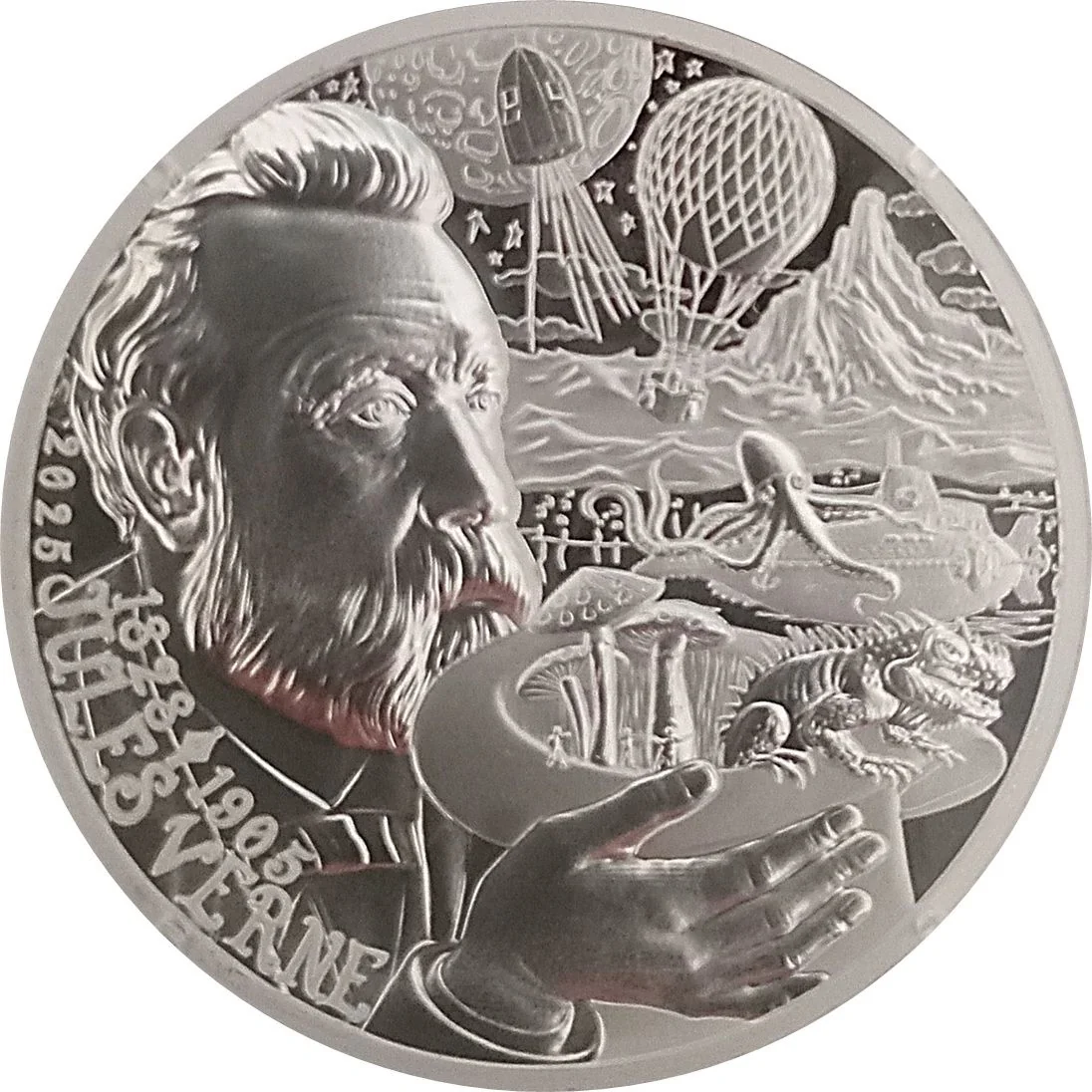 Jules Verne’s face and his global work are depicted as a magician revealing inventions from a top hat. References to his major novels blend together to represent Les Voyages extraordinaires. His name, dates, and year appear to the portrait's left.
