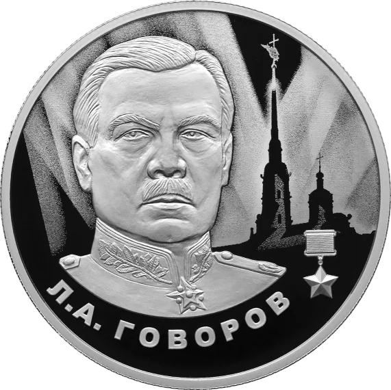 The reverse shows a laser-matte portrait of Leonid Govorov with the Gold Star medal, set before the searchlit silhouette of the Peter and Paul Cathedral, with the inscription "Л.А. ГОВОРОВ" below.