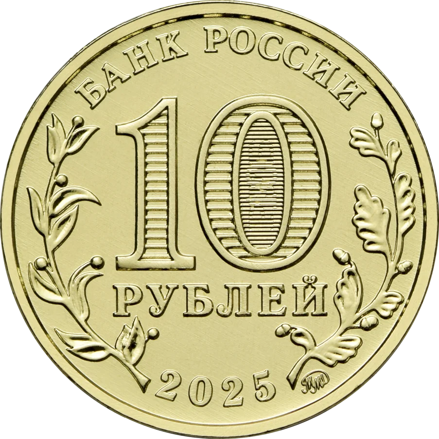 The obverse features "БАНК РОССИИ" at the top and "2025" at the bottom, with laurel and oak twigs on the sides. The central "10" over "РУБЛЕЙ" includes a security element within the zero showing "10" and "РУБ" at different angles. The Moscow Mint mark is at the bottom.
