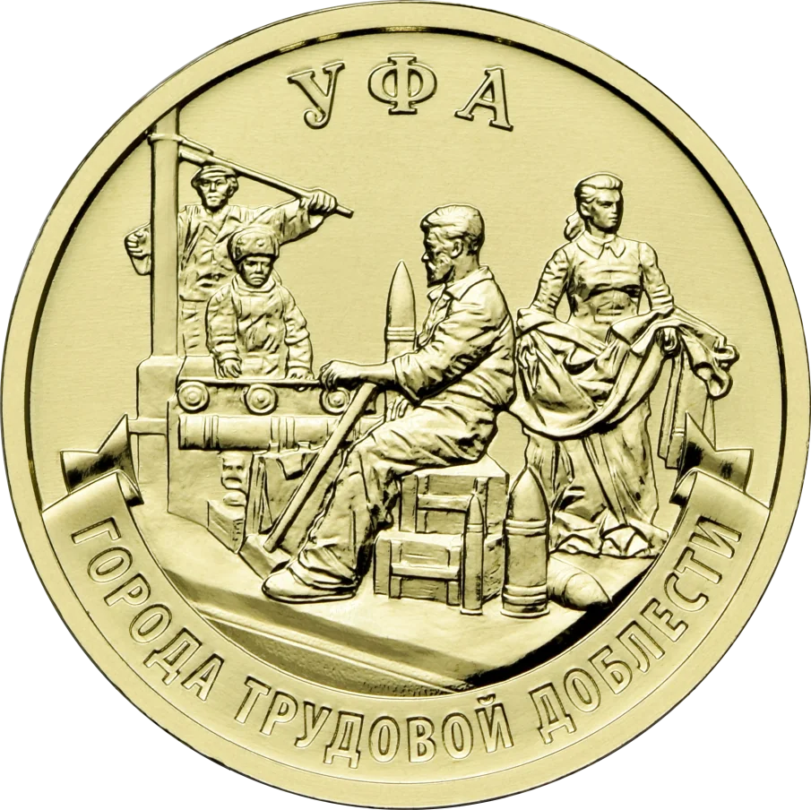 The reverse shows a fragment of the home front workers monument, with "УФА" above and "ГОРОДА ТРУДОВОЙ ДОБЛЕСТИ" below along a ribbon.