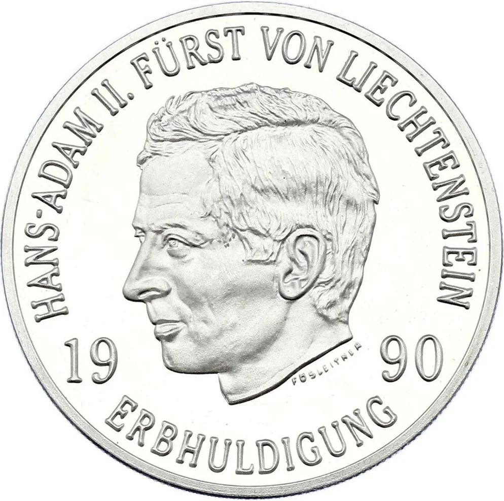 Hans-Adam II facing left, surrounded by lettering.