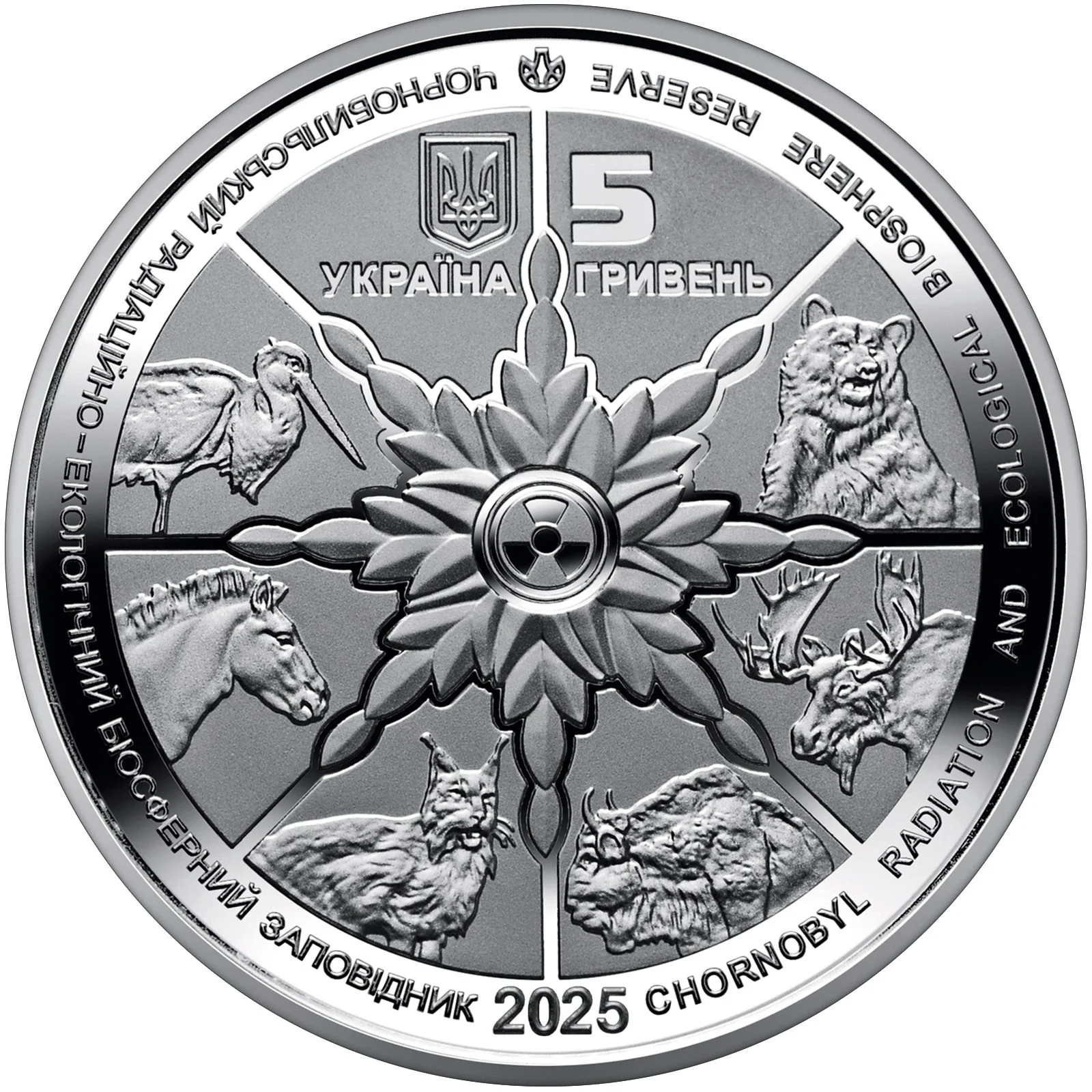 The obverse features Ukraine's State Coat of Arms with inscriptions. Centered is a "wheel of life"—a radiation symbol entwined with leaves, surrounded by animals like black storks, Przewalski's horses, lynx, bison, elk, and brown bear, representing the exclusion zone's revival. Circular inscriptions name the Chornobyl Radiation and Ecological Biosphere Reserve. It also shows the denomination (5 Hryven), year (2025), and mint mark.