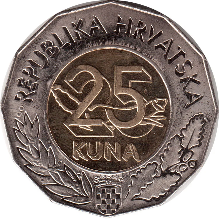 The brass center features the number "25" with a marten running right within its contours, and the word "KUNA" below. The outer ring displays the Croatian coat of arms flanked by laurel and oak branches, with "REPUBLIKA HRVATSKA" above.