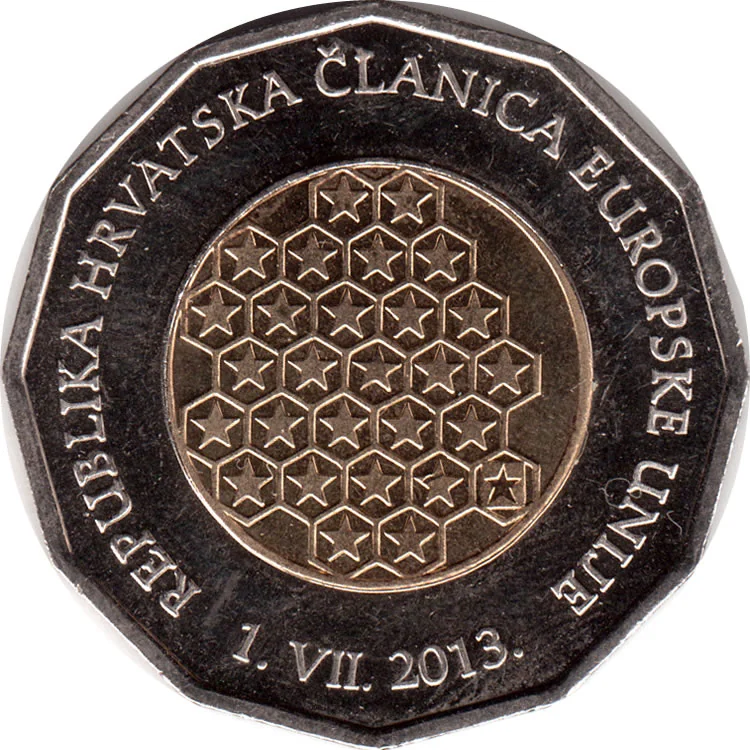 The brass center features a stylized honeycomb representing the European Union. Its twenty-seven star-filled cells are joined by a twenty-eighth cell containing a square and star, symbolizing Croatia's accession. The ring reads "REPUBLIKA HRVATSKA CLANICA EUROPSKE UNIJE" with the date "1.VII.2013" below.