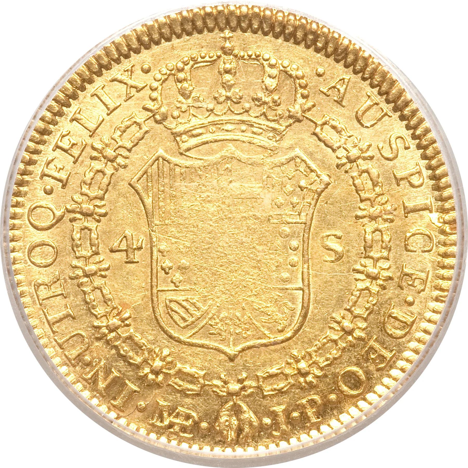 Spanish arms with crown, encircled by chain, flanked by value and legend.