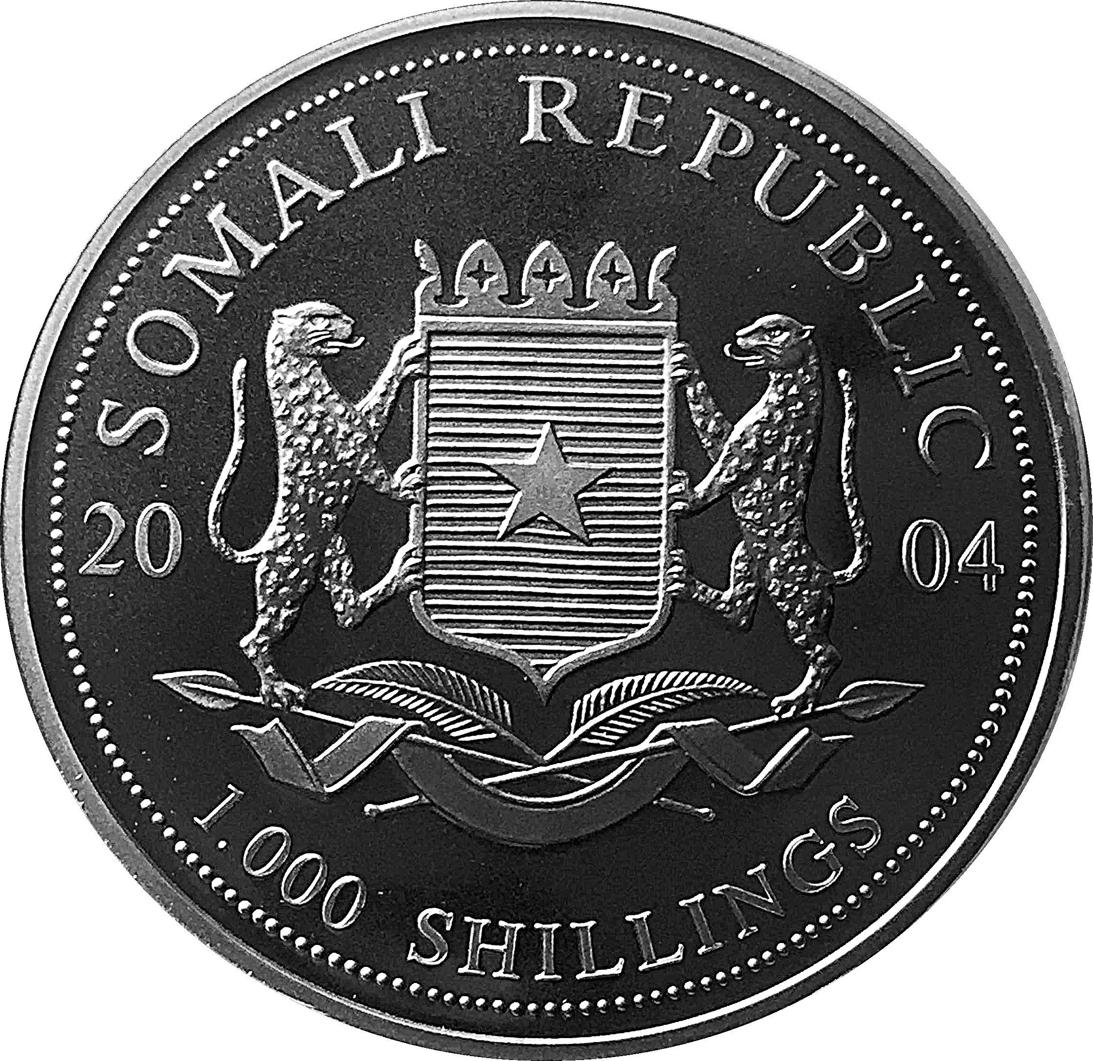 Somalia's coat of arms, the 1000 shilling value, and the date.