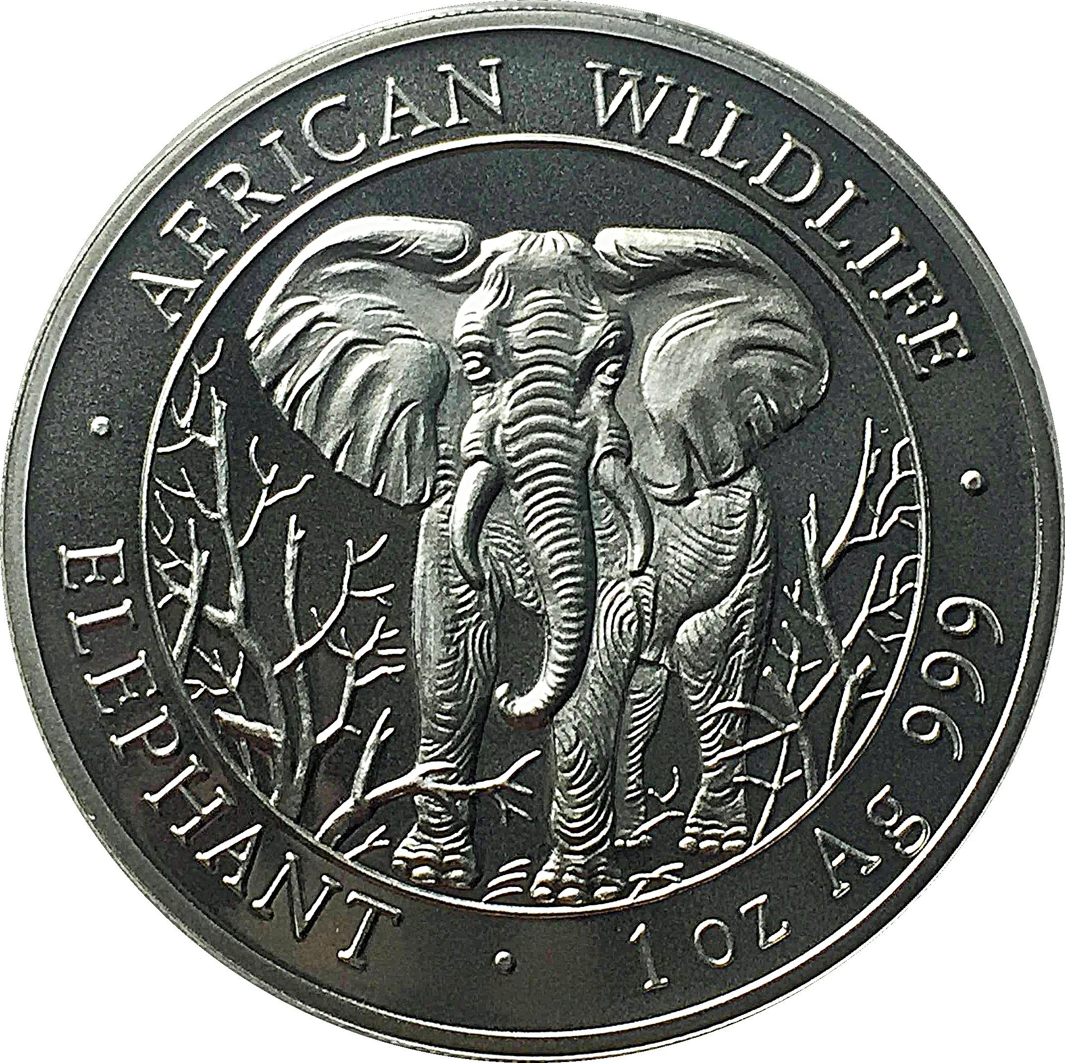 A lone elephant in African brush, with the coin's weight and purity along the rim.