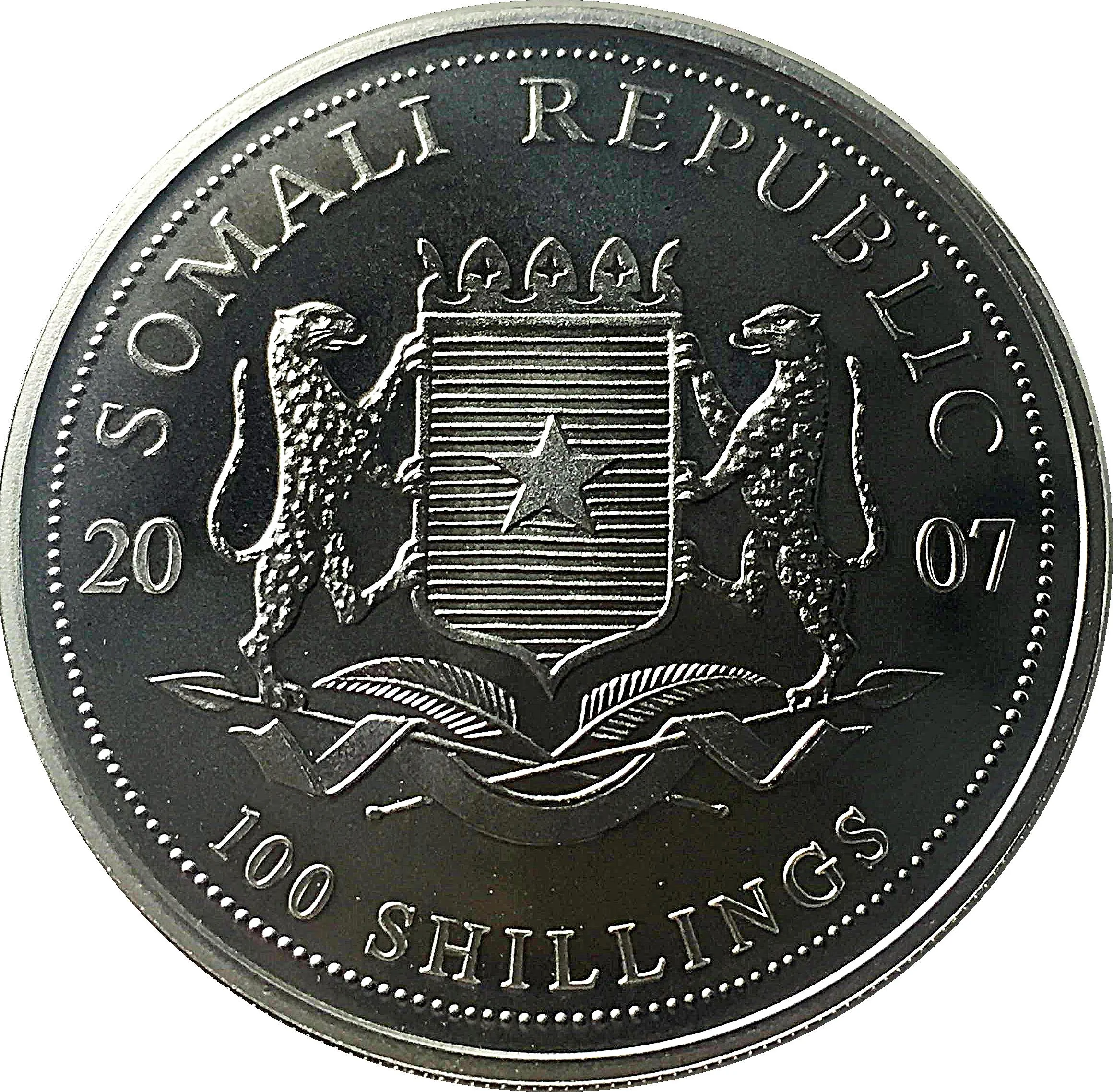 Somalia's coat of arms, 100 shillings, and the date.