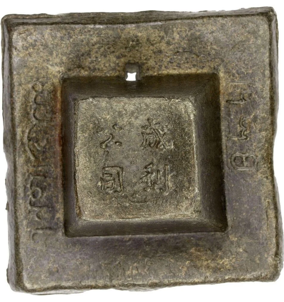Four-sided pyramid with central peak. Chinese text on peak, retrograde Arabic on plinth.