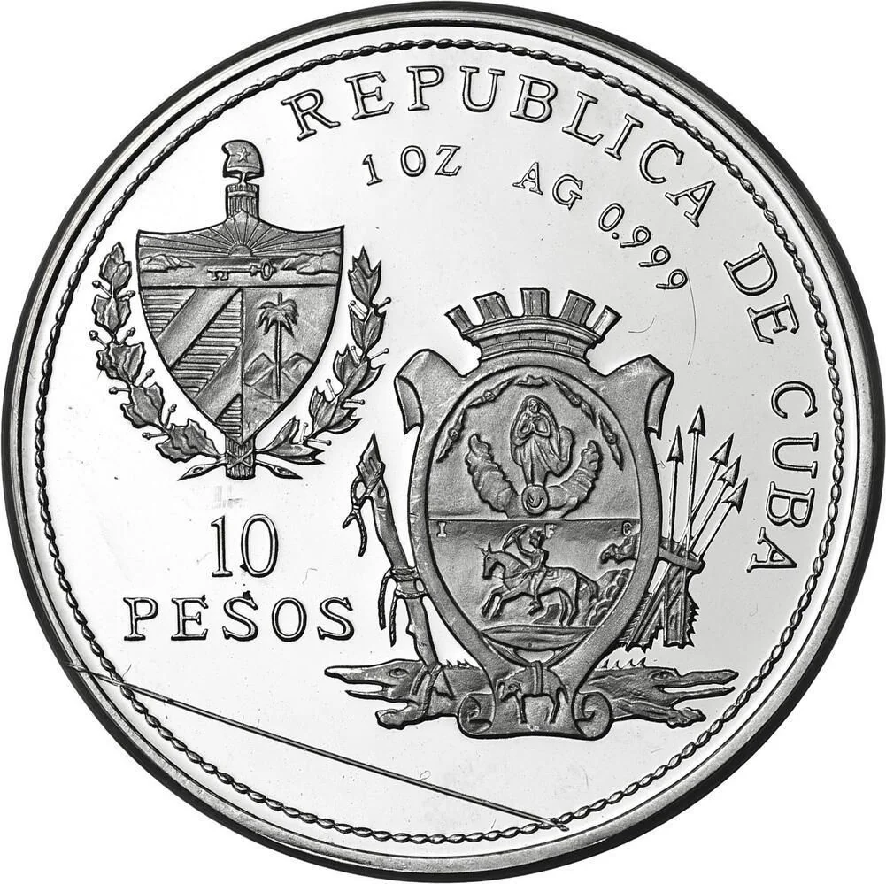 Cuban coat of arms top left, Santiago de Cuba arms lower right. Country name above and right, weight and fineness below. Face value lower left. Dotted line near edge.