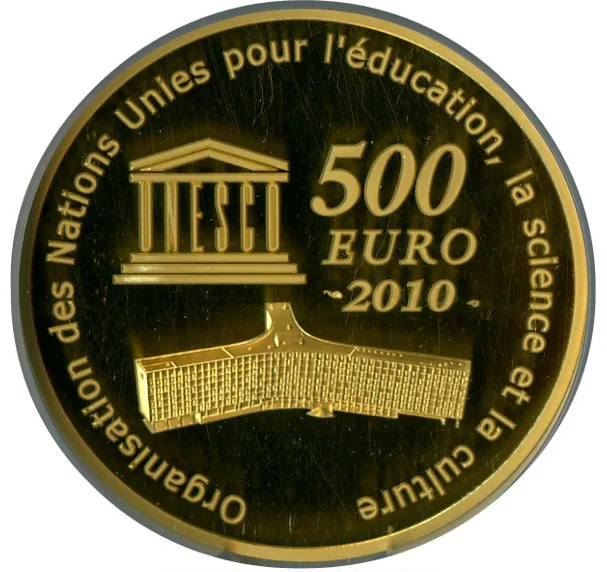 UNESCO headquarters and logo in France. The coin's edge reads "United Nations Educational, Scientific and Cultural Organization," while the center features "500 EURO" and "2010."