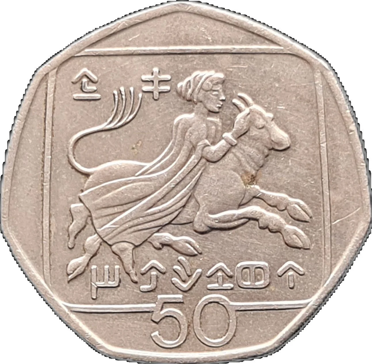 A composition based on a 4th-century BC coin from Cyprus's Kingdom of Marion, depicting Zeus as a bull abducting Europa. Includes "King Timocharis" in Cypriot syllabary.