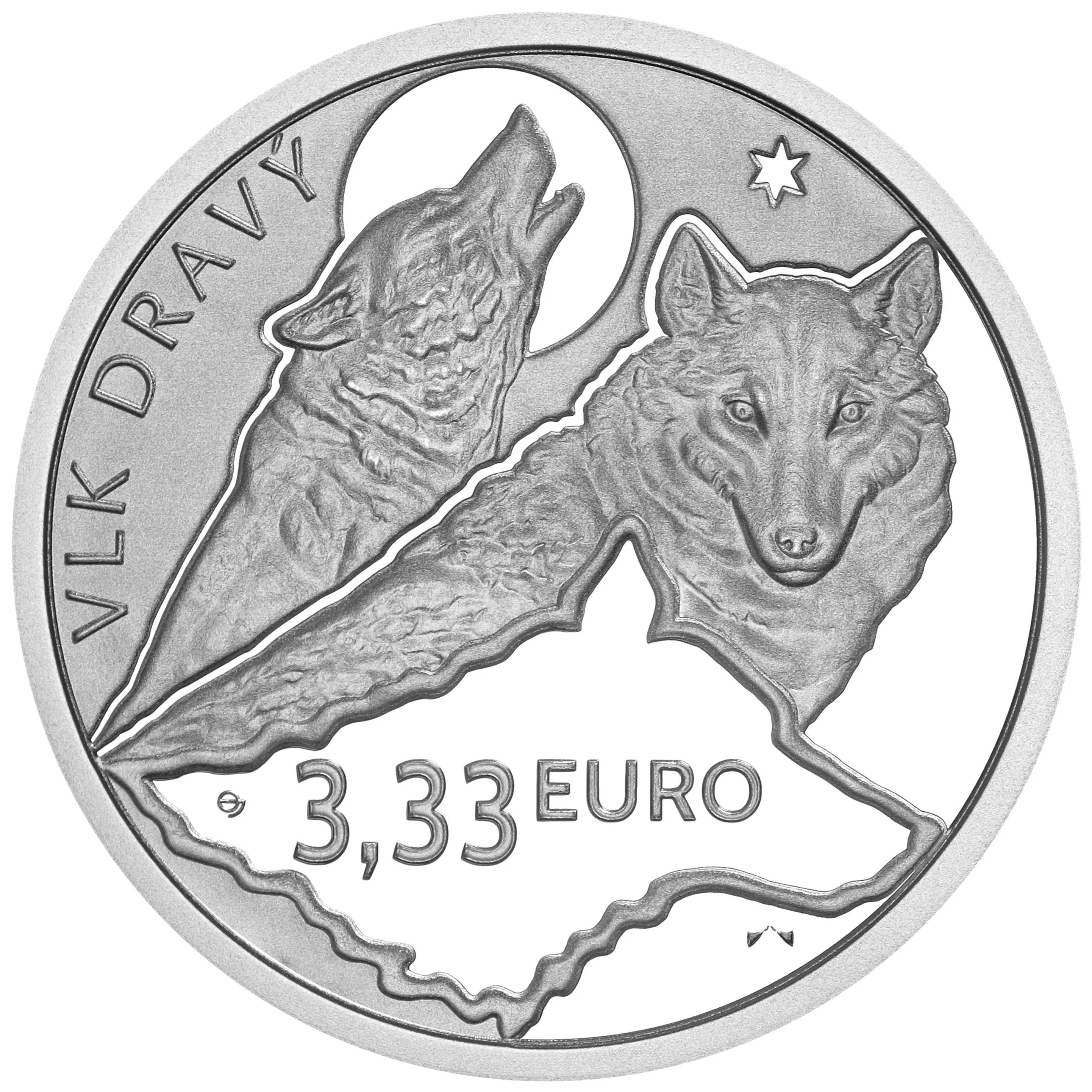 The reverse features two wolves, one howling at a moon and star. Below is a wolf's head outline containing the denomination '3,33 EURO' and the designer's initials 'JO'. The mint mark of Bratislava Castle is at bottom right, with 'VLK DRAVÝ' inscribed along the upper left edge.
