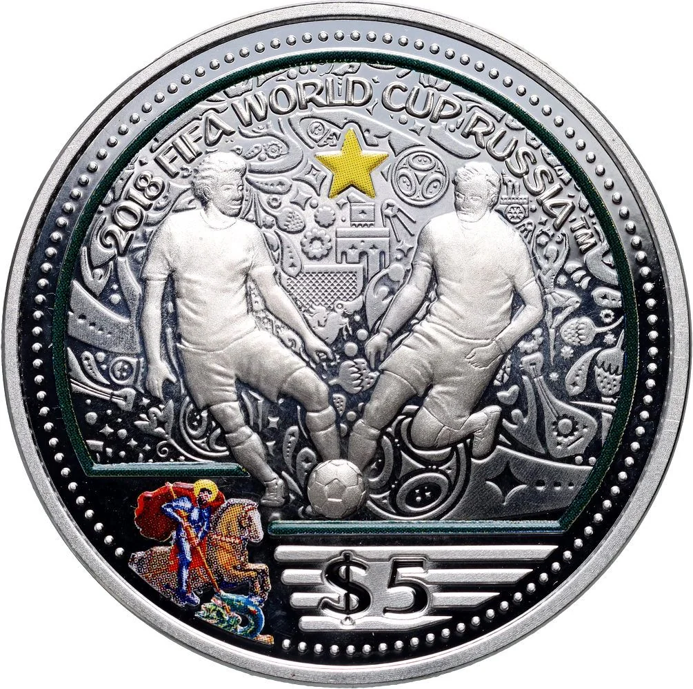 Two footballers tackling, a yellow star between them, on a World Cup/Russian ornamental background. St. George slaying the dragon at lower left, five stripes with "$5" at lower right.