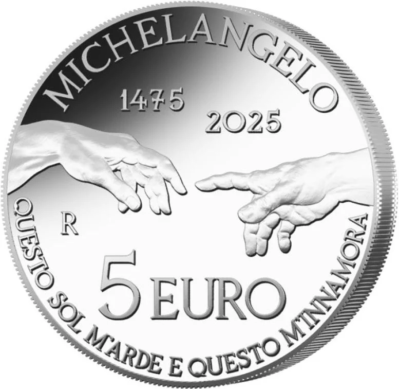 Center: detail from the Sistine Chapel's "Creation of Adam." Arching above: "MICHELANGELO." In field: dates "1475" and "2025." Arching below: inscription "QUESTO SOL M’ARDE E QUESTO M’INNAMORA." At bottom: "5 EURO." On left: "R" for Rome Mint.