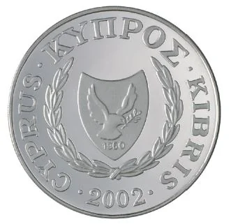 A dove with an olive twig and "1960," surrounded by laurels. "Cyprus" in Greek and Turkish.