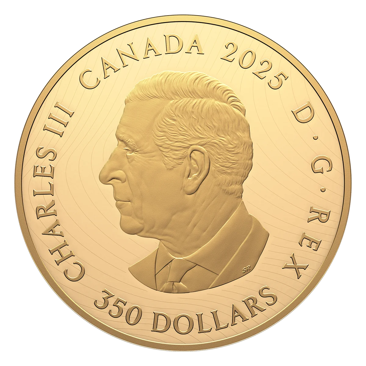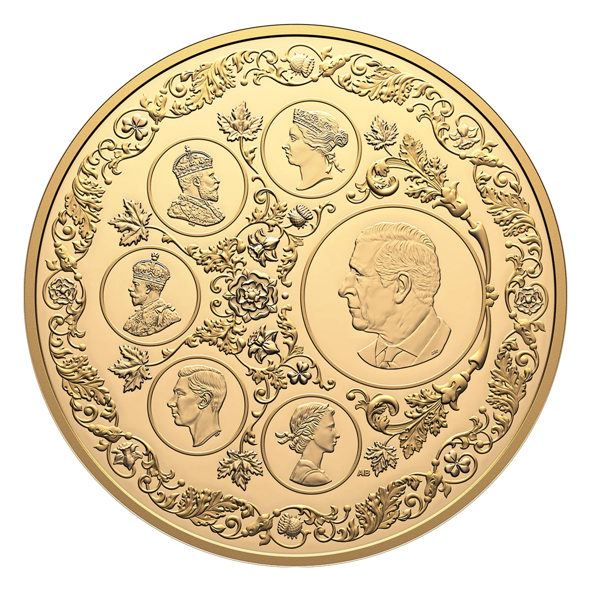 The reverse features a circular arrangement of effigies of every monarch on Canadian coins since Confederation: Victoria, Edward VII, George V, George VI, Elizabeth II, and Charles III. These portraits are surrounded by the floral emblems of the UK and Canada, bordered by acanthus leaves.