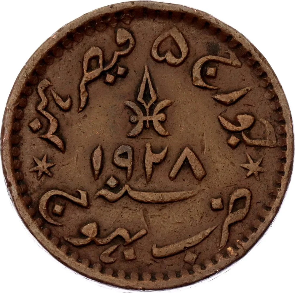 Outer margin: Urdu legend "George V, Kaiser Hind, Zarb Bhuj." Vertical dagger, "Sanah," with AD date below in center.