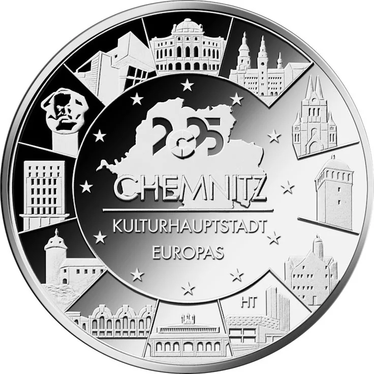 Map of Chemnitz surrounded by 12 stars and 12 local buildings.