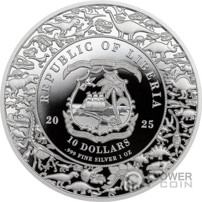 Coat of arms divides date, country name above, value and details below. Dinosaurs surround.
